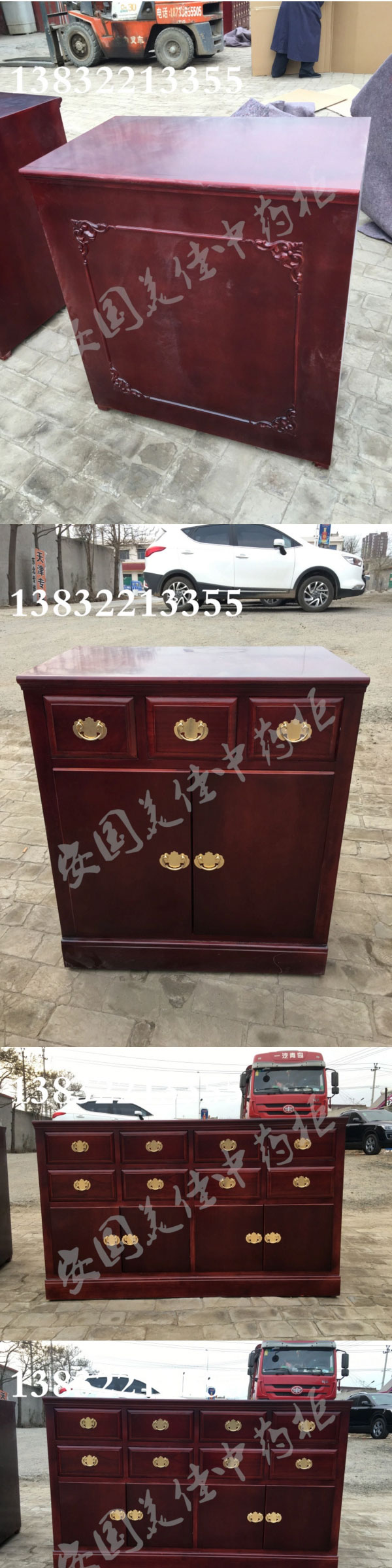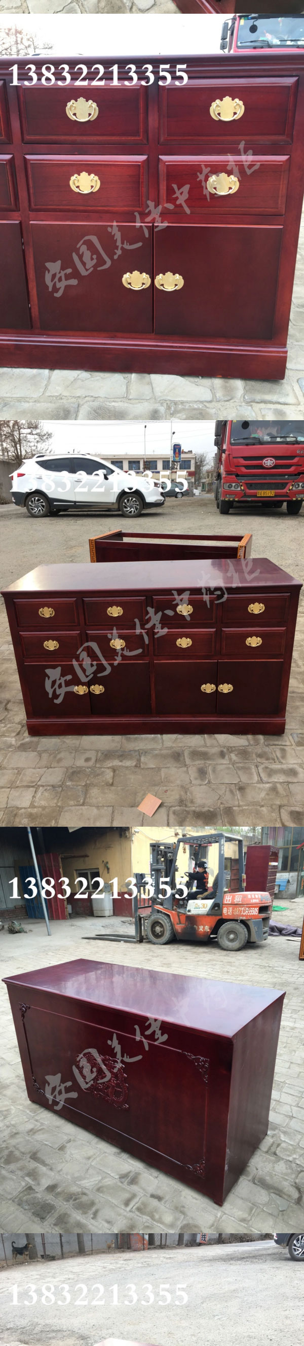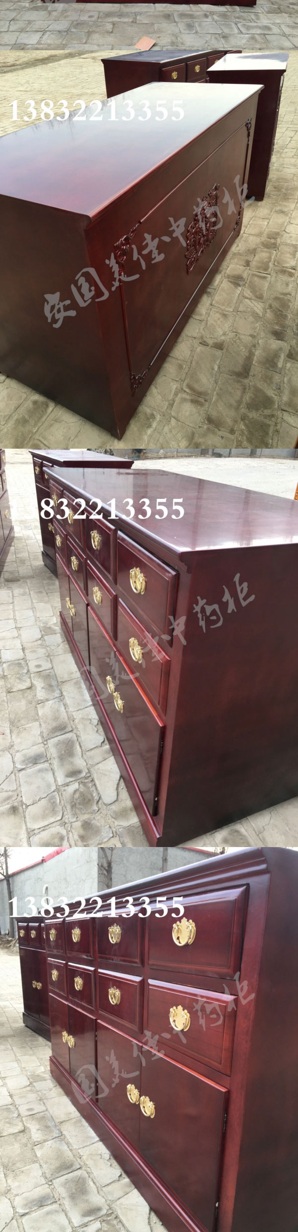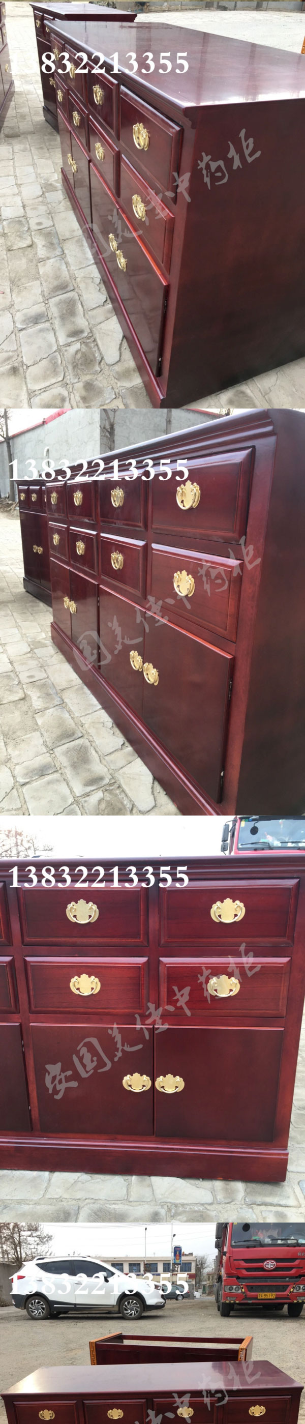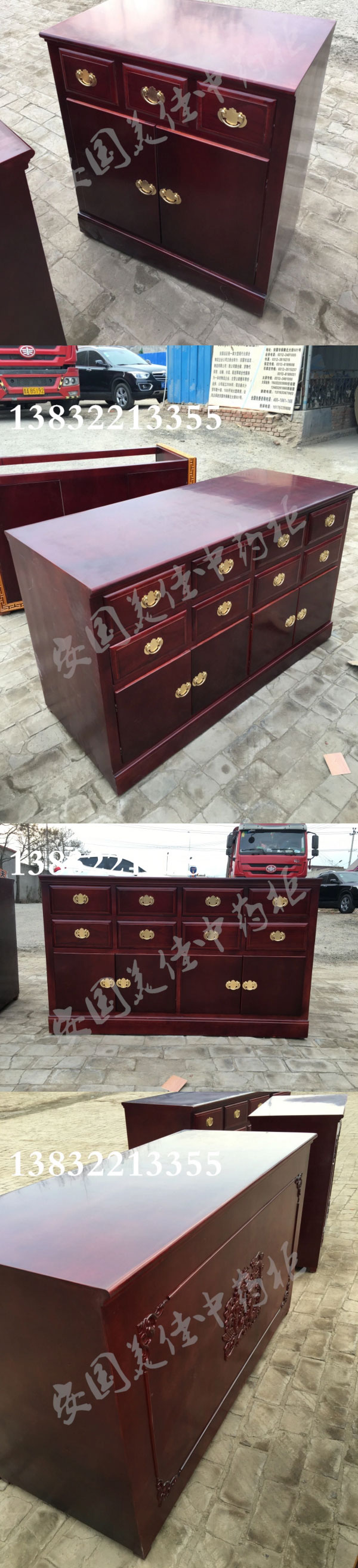 中藥柜展示臺用料---框架和抽屜選用優質樟松木,抽屜下面有五合板封底,防串味,抽屜底選用七和板,前臺的后背兩側選用加厚板。