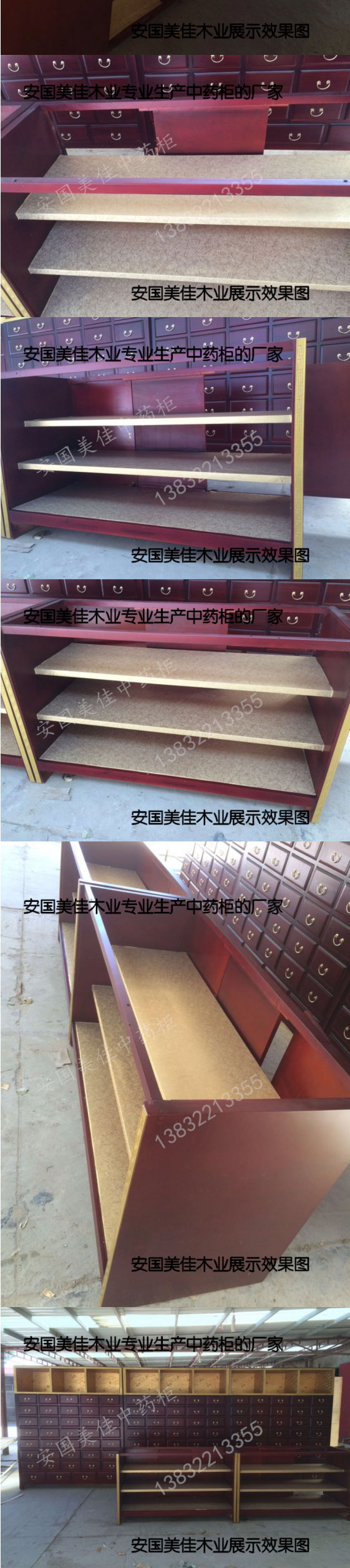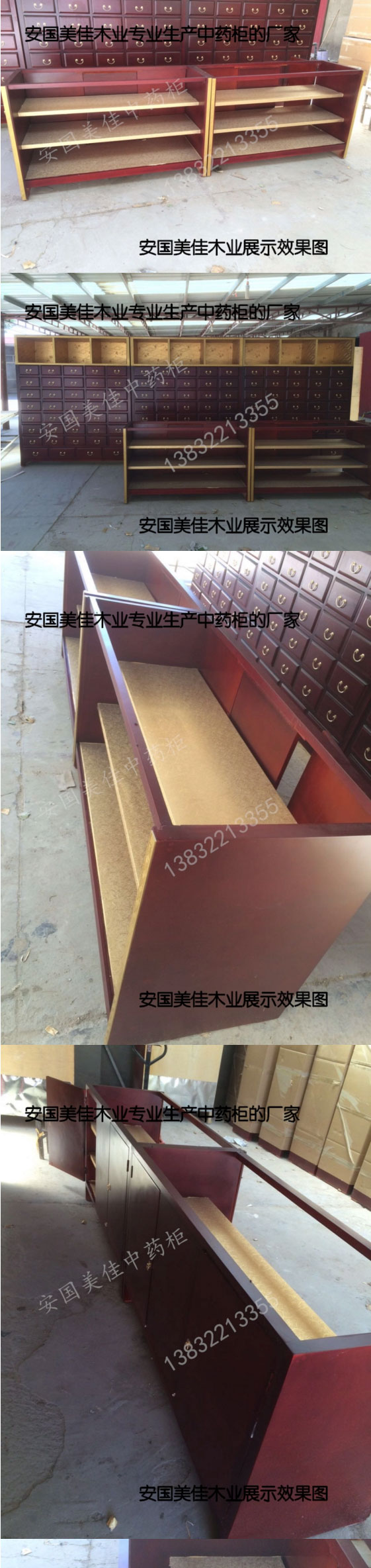 中藥柜展示臺用料---框架和抽屜選用優(yōu)質(zhì)樟松木,抽屜下面有五合板封底,防串味,抽屜底選用九厘板,中藥柜的后背兩側(cè)頂部選用五合板。