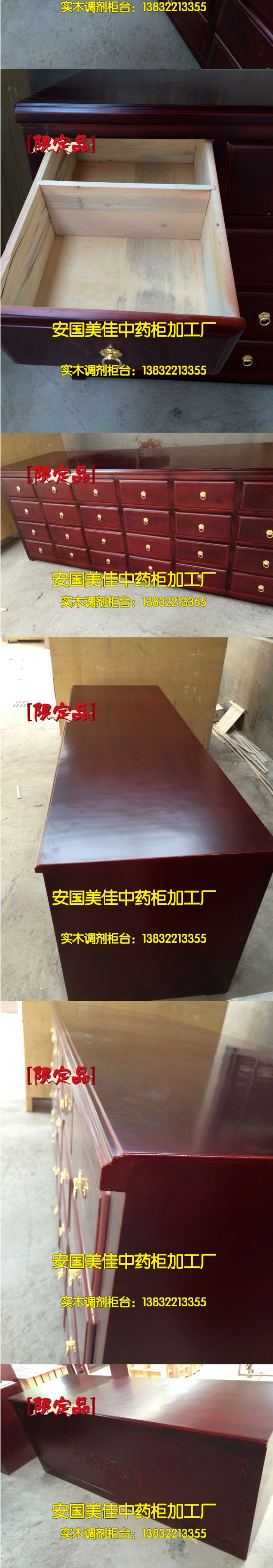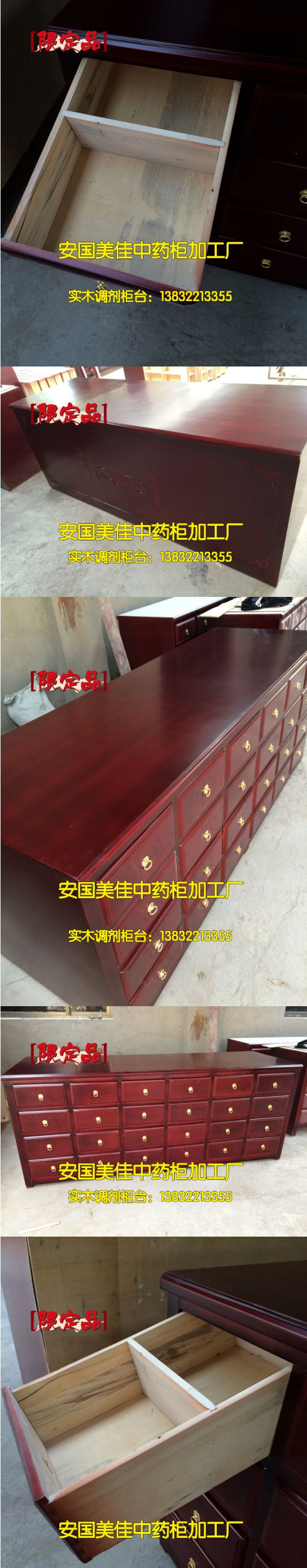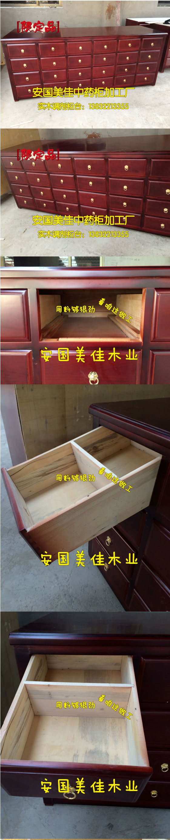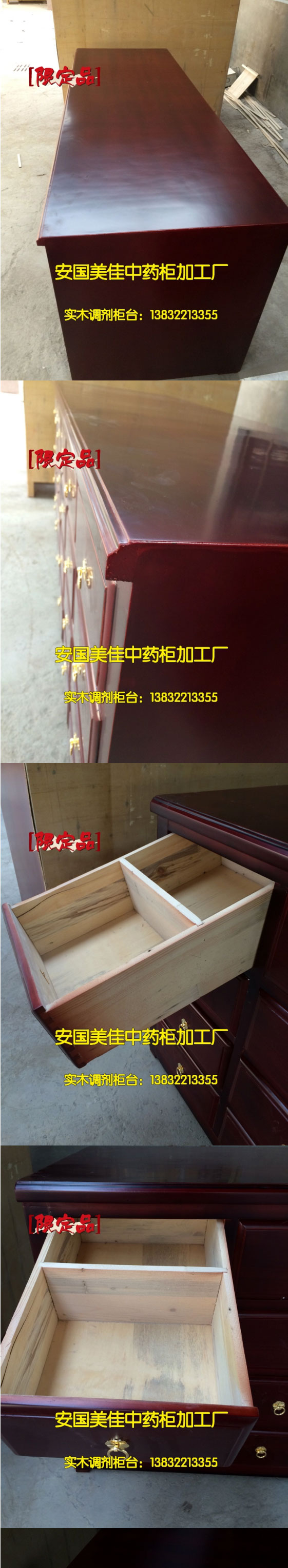 中藥柜展示臺(tái)尺寸---高90公分,寬200公分,厚61公分。中藥柜展示臺(tái)用料---框架和抽屜選用優(yōu)質(zhì)樟松木,抽屜下面有七合板封底,防串味,抽屜底選用九厘板,中藥柜的后背兩側(cè)頂部選用五合板。中藥柜規(guī)格: 橫六豎四,共計(jì)24個(gè)抽屜。每個(gè)抽屜分為兩個(gè)大格子。中藥柜顏色: 標(biāo)準(zhǔn)藥店使用 仿紅木色烤漆。顏色可以自選。中藥柜拉手: 鍍銅拉環(huán),經(jīng)典小圈圈形狀。