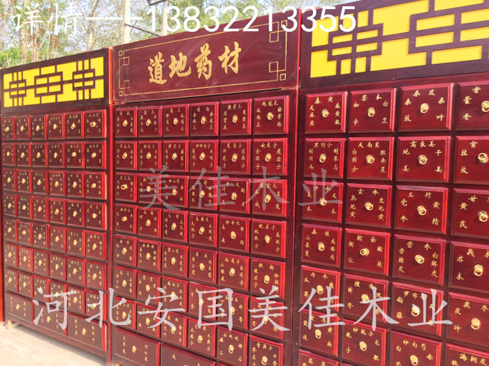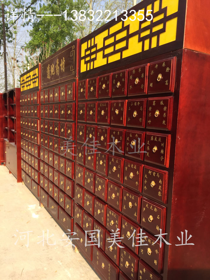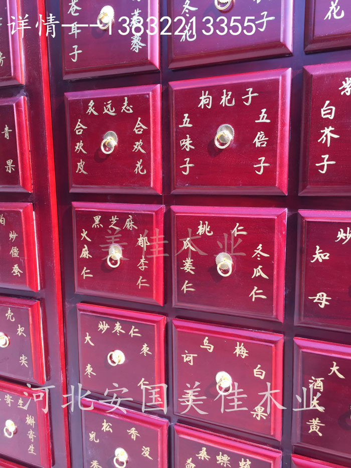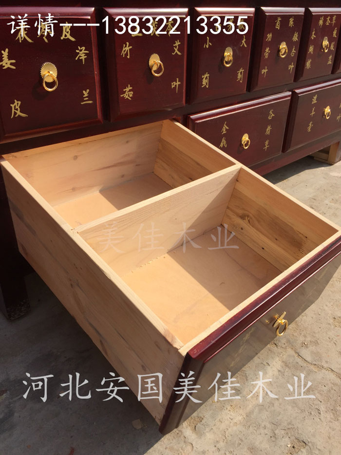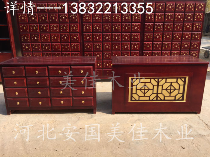 中藥柜尺寸---高220公分,寬150公分,厚60公分。抽屜面尺寸:寬18公分,高16公分。厚度18公分。中藥柜用料---框架和抽屜選用優質樟松木,抽屜下面有五合板封底,防串味,抽屜底選用七合板,中藥柜的后背兩側頂部選用七合板。中藥柜款式---橫六豎八款。橫著六個抽屜,豎著八層抽屜,較下面的三個大抽屜。根據客戶要求定做。中藥柜顏色---經典琥珀色花紋烤漆。燈箱外邊雕刻花型。中藥柜用漆---亮光或者半啞環保聚脂漆水房烤漆。中藥柜拉環---超精致純銅拉環。