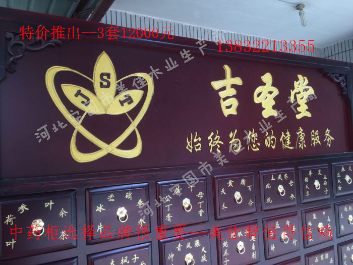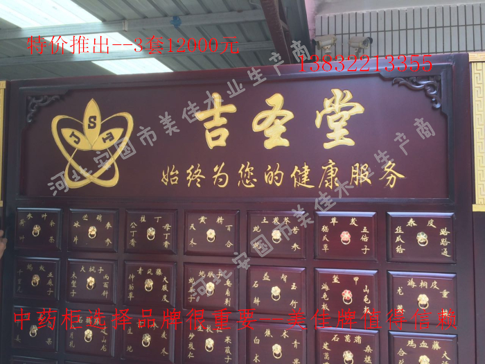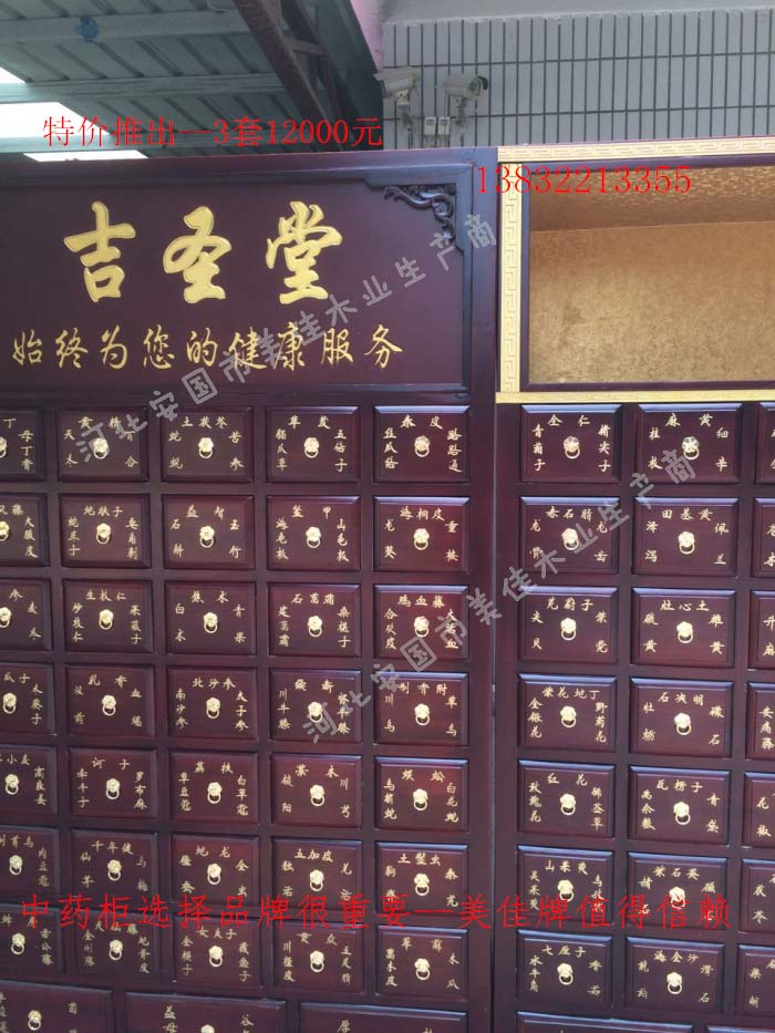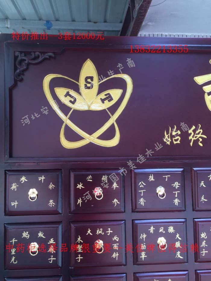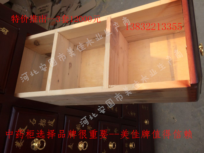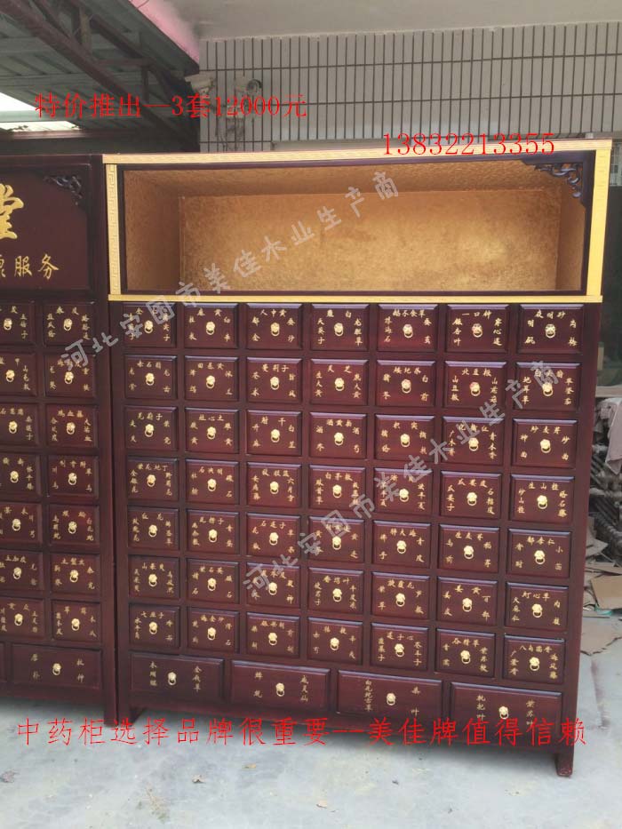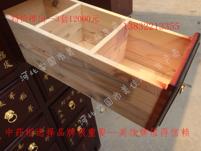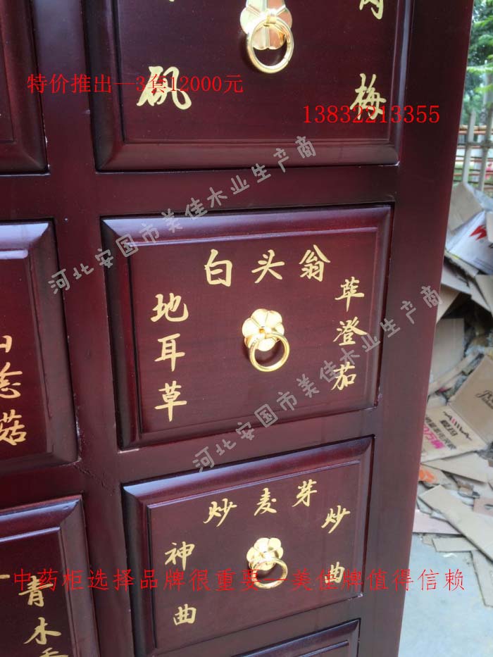 中藥柜尺寸---高215公分,寬170公分,厚60公分。抽屜面尺寸:寬18公分,高17公分。高度15公分。中藥柜用料---框架和抽屜選用優質樟松木,抽屜下面有五合板封底,防串味,抽屜底選用九厘板,中藥柜的后背兩側頂部選用五合板。中藥柜款式---橫七豎八款。橫著七個抽屜,豎著八層抽屜,較下面的四個大抽屜,每個抽屜兩味藥,每個中藥柜可以裝155味藥。中藥柜顏色---經典仿紅木色亮光花紋烤漆。中藥柜用漆---亮光或者半啞環保聚脂漆水房烤漆。中藥柜拉環---超精致純銅拉環。