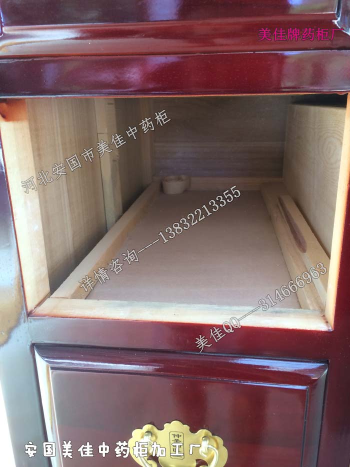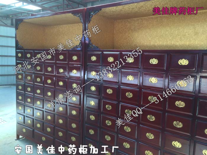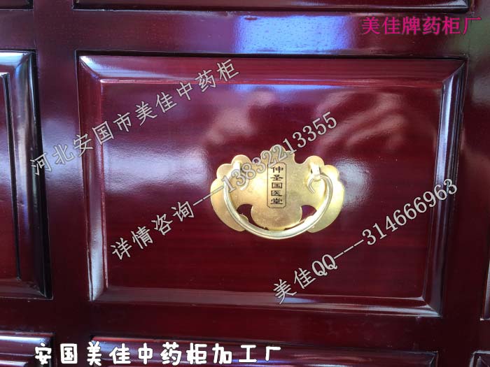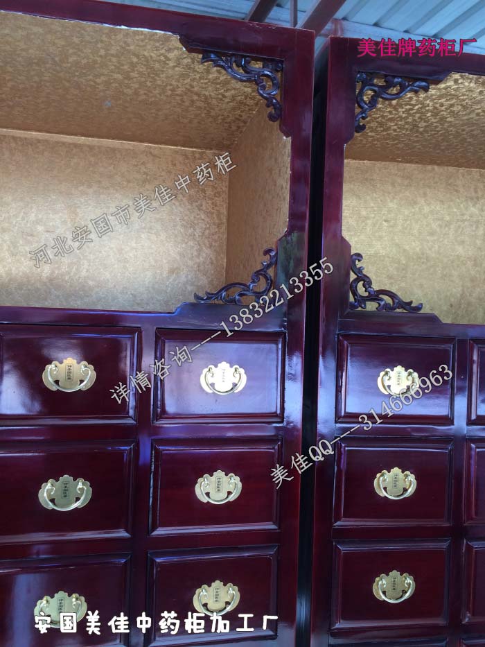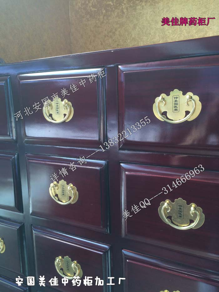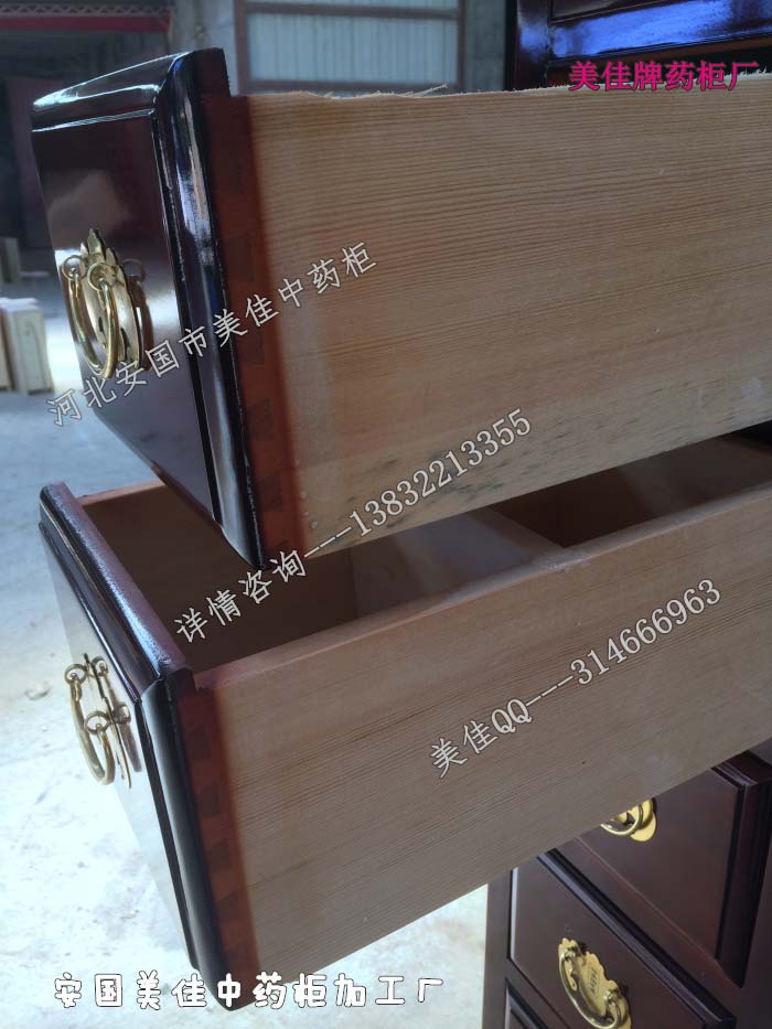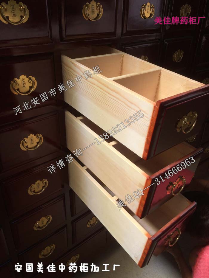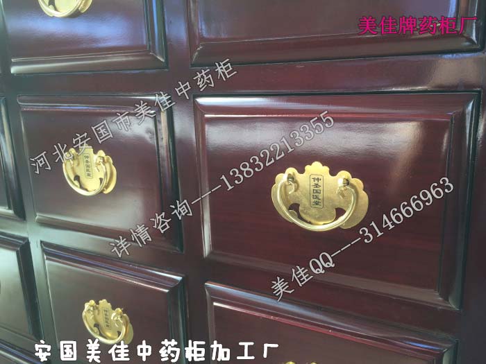 中藥柜尺寸---高215公分,寬150公分,厚60公分。抽屜面尺寸:寬18公分,高19公分。中藥柜用料---框架和抽屜選用優質樟松木,抽屜下面全部實木,防串味,抽屜底選用九厘板,中藥柜的后背兩側頂部選用實木板。中藥柜款式---橫六豎九款。橫著六個抽屜,豎著八層抽屜,較下面的三個大抽屜,每個抽屜兩味藥,每個中藥柜可以裝150味藥。中藥柜顏色---經典栗子色木色花紋烤漆。中藥柜用漆---亮光或者半啞環保聚脂漆水房烤漆。中藥柜拉環---超精致純銅拉環,刻藥店名稱。