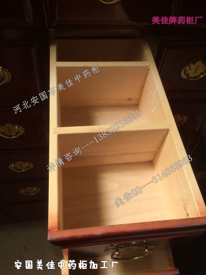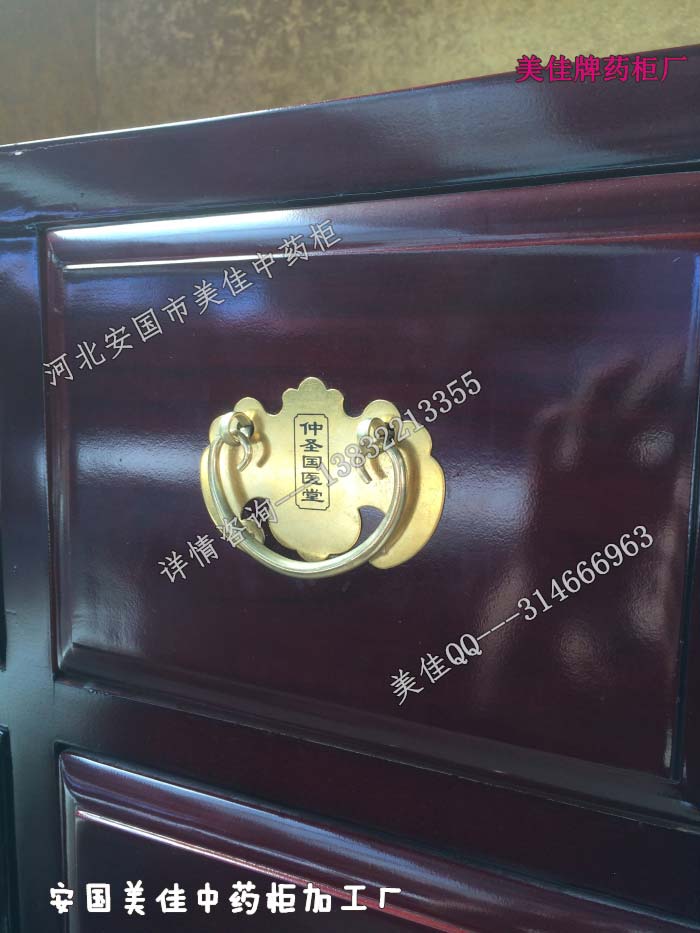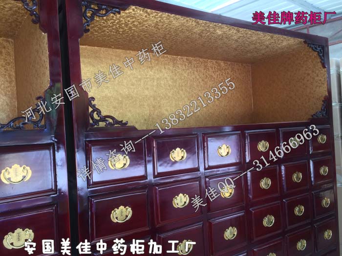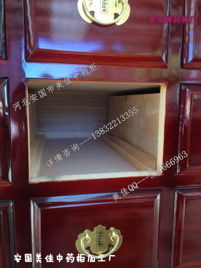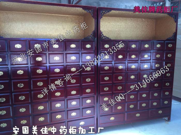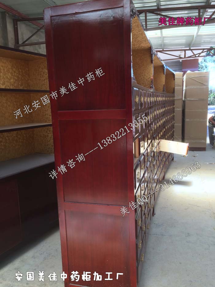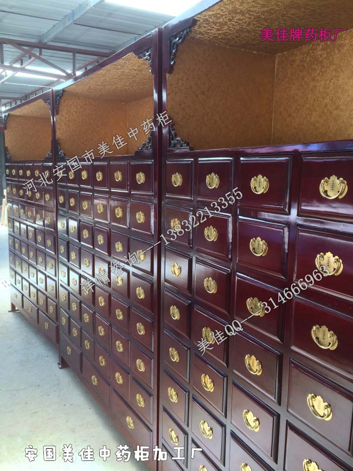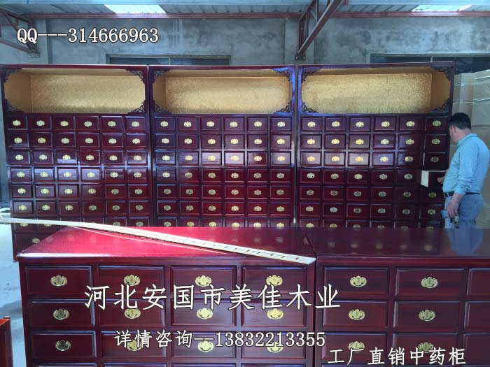中藥柜尺寸---高215公分,寬150公分,厚60公分。抽屜面尺寸:寬18公分,高19公分。中藥柜用料---框架和抽屜選用優質樟松木,抽屜下面全部實木,防串味,抽屜底選用九厘板,中藥柜的后背兩側頂部選用實木板。中藥柜款式---橫六豎九款。橫著六個抽屜,豎著八層抽屜,較下面的三個大抽屜,每個抽屜兩味藥,每個中藥柜可以裝150味藥。中藥柜顏色---經典栗子色木色花紋烤漆。中藥柜用漆---亮光或者半啞環保聚脂漆水房烤漆。中藥柜拉環---超精致純銅拉環,刻藥店名稱。