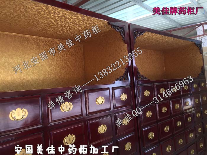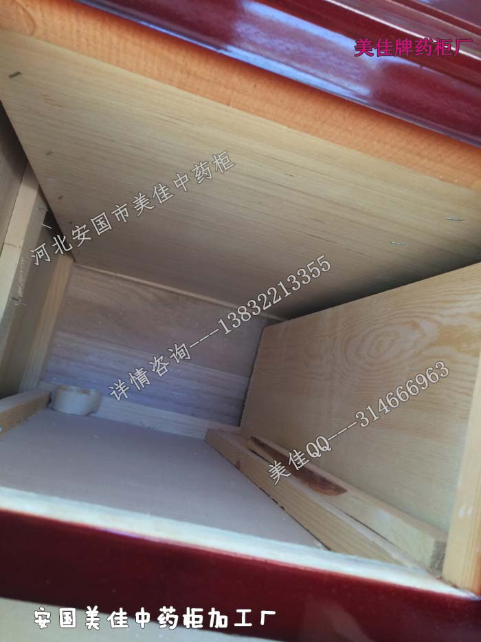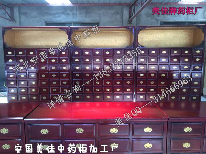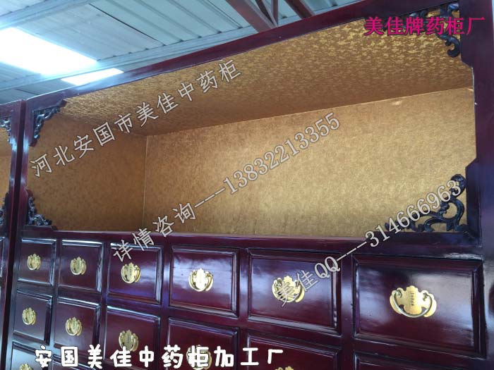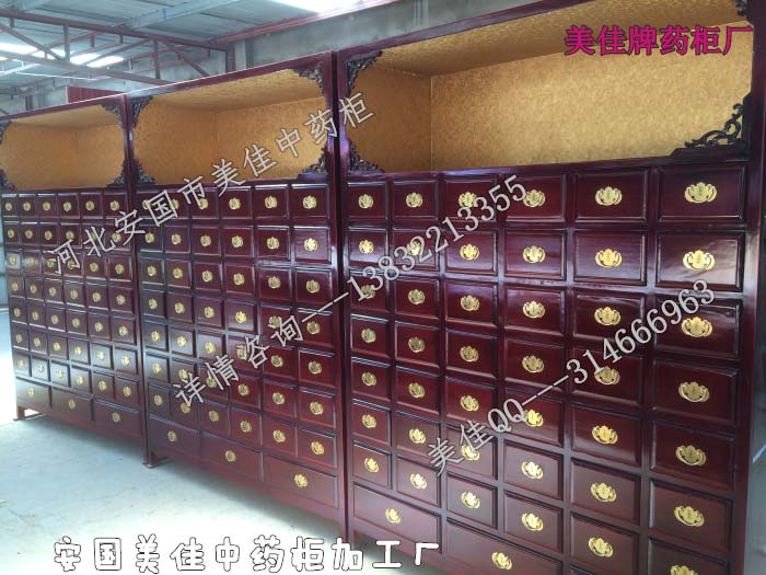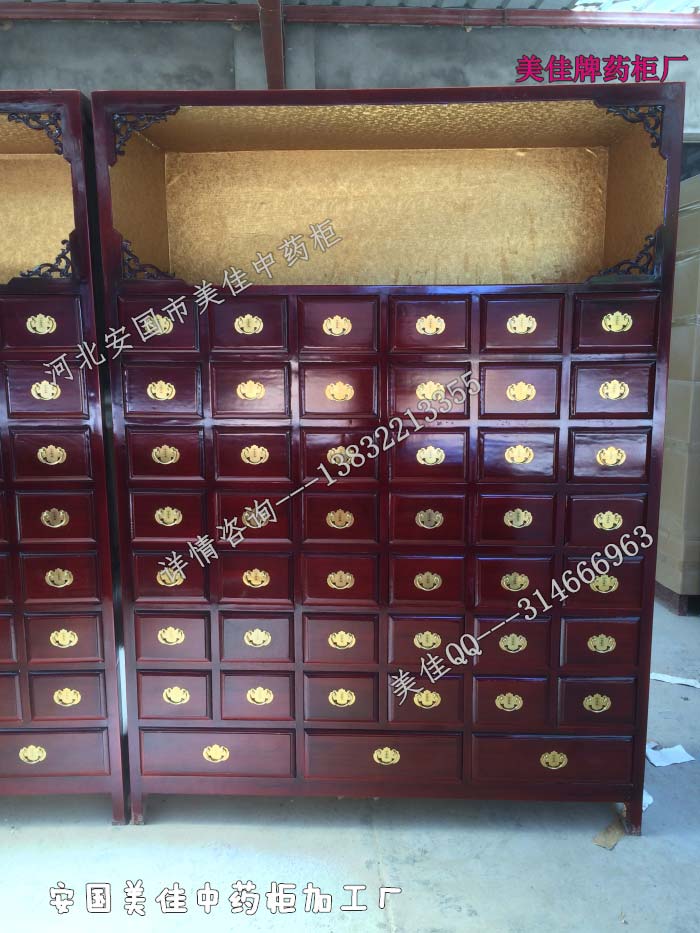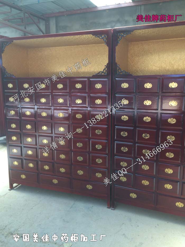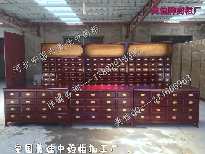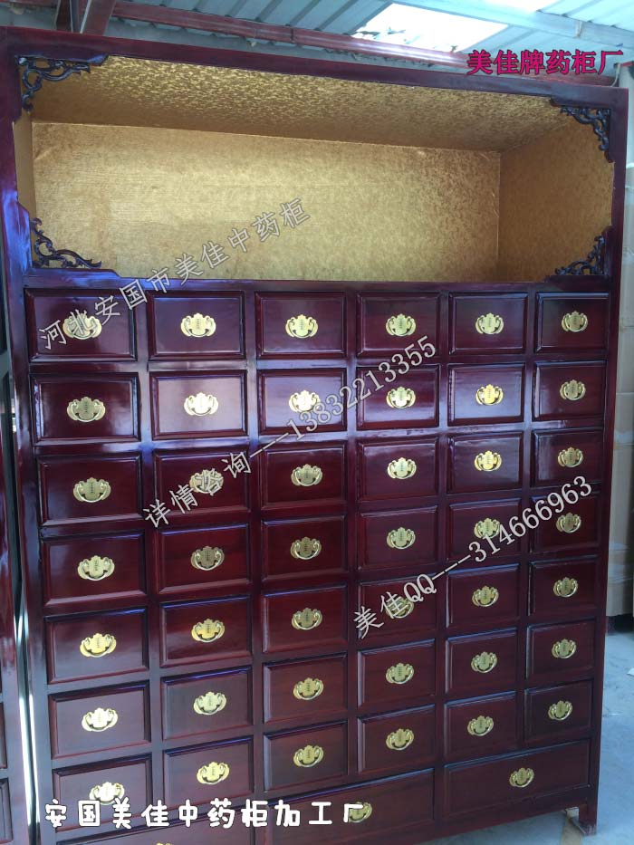 中藥柜尺寸---高215公分,寬150公分,厚60公分。抽屜面尺寸:寬18公分,高19公分。中藥柜用料---框架和抽屜選用優質樟松木,抽屜下面全部實木,防串味,抽屜底選用九厘板,中藥柜的后背兩側頂部選用實木板。中藥柜款式---橫六豎九款。橫著六個抽屜,豎著八層抽屜,較下面的三個大抽屜,每個抽屜兩味藥,每個中藥柜可以裝150味藥。中藥柜顏色---經典栗子色木色花紋烤漆。中藥柜用漆---亮光或者半啞環保聚脂漆水房烤漆。中藥柜拉環---超精致純銅拉環,刻藥店名稱。
