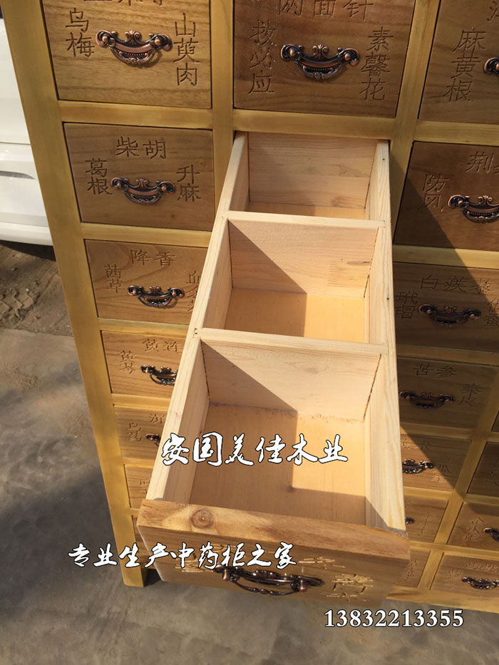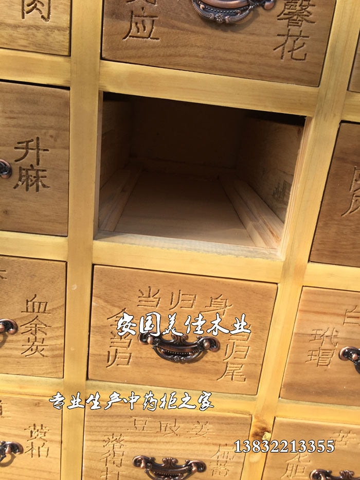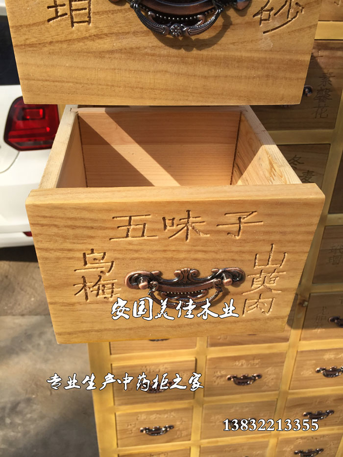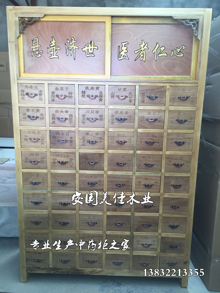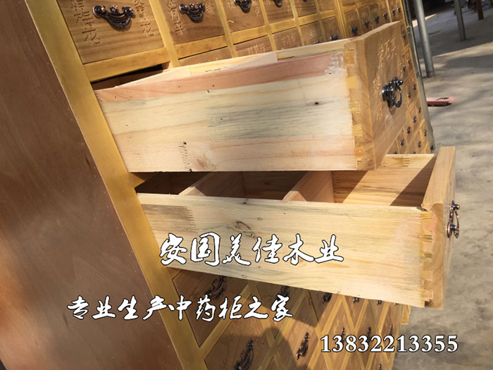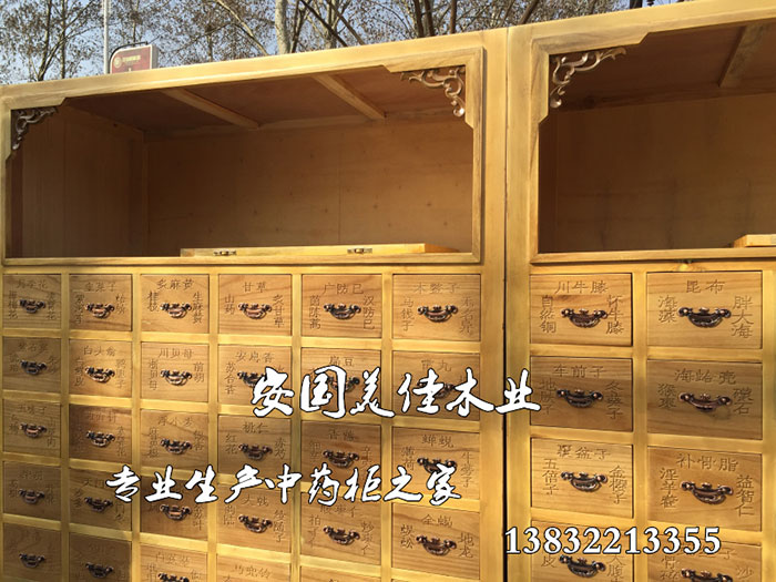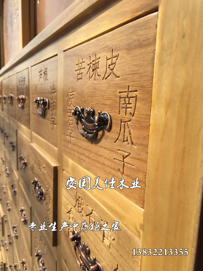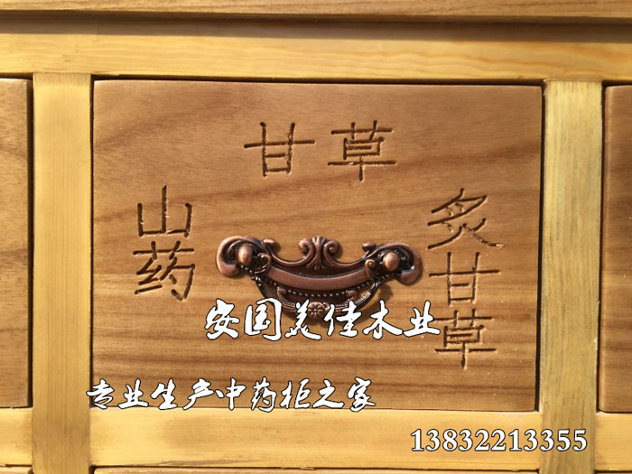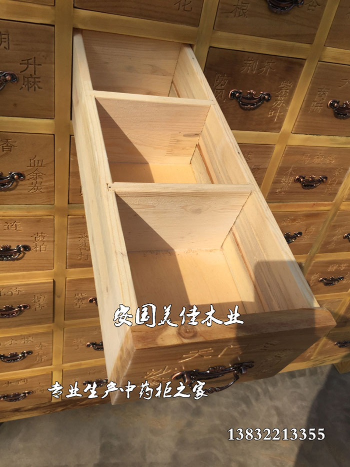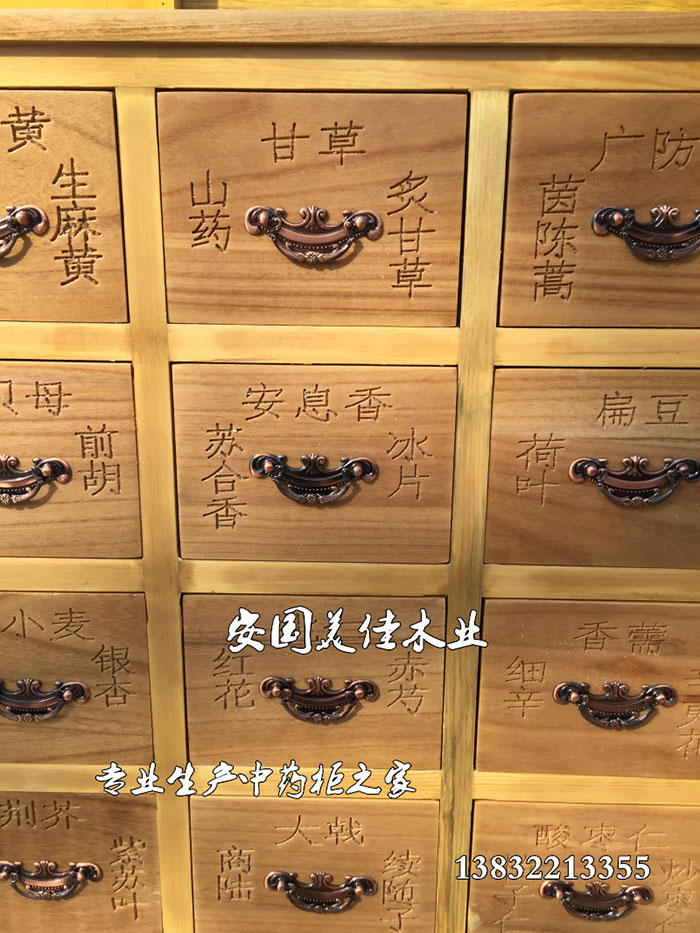中藥柜尺寸---高215公分,寬140公分,厚60公分。抽屜面尺寸:寬15公分,高14公分。厚度17公分。 中藥柜用料---框架和抽屜選用優質樟松木,抽屜下面有五合板封底,防串味,抽屜底選用九厘板,中藥柜的后背兩側頂部選用五合板。 中藥柜款式---橫六豎九款。橫著六個抽屜,豎著八層抽屜,較下面的三個大抽屜,每個抽屜兩味藥,每個中藥柜可以裝150味藥。 中藥柜顏色---經典原木色花紋烤漆。抽屜面板雕刻字體。 中藥柜用漆---亮光或者半啞環保聚脂漆水房烤漆。 中藥柜拉環---超精致拉手。