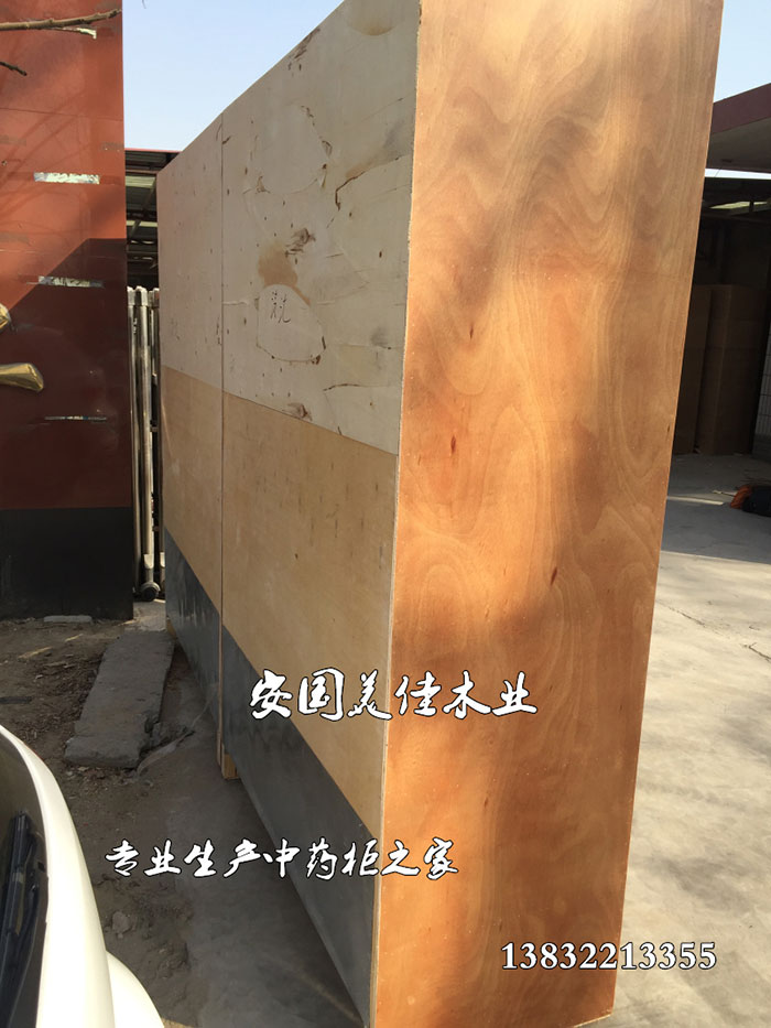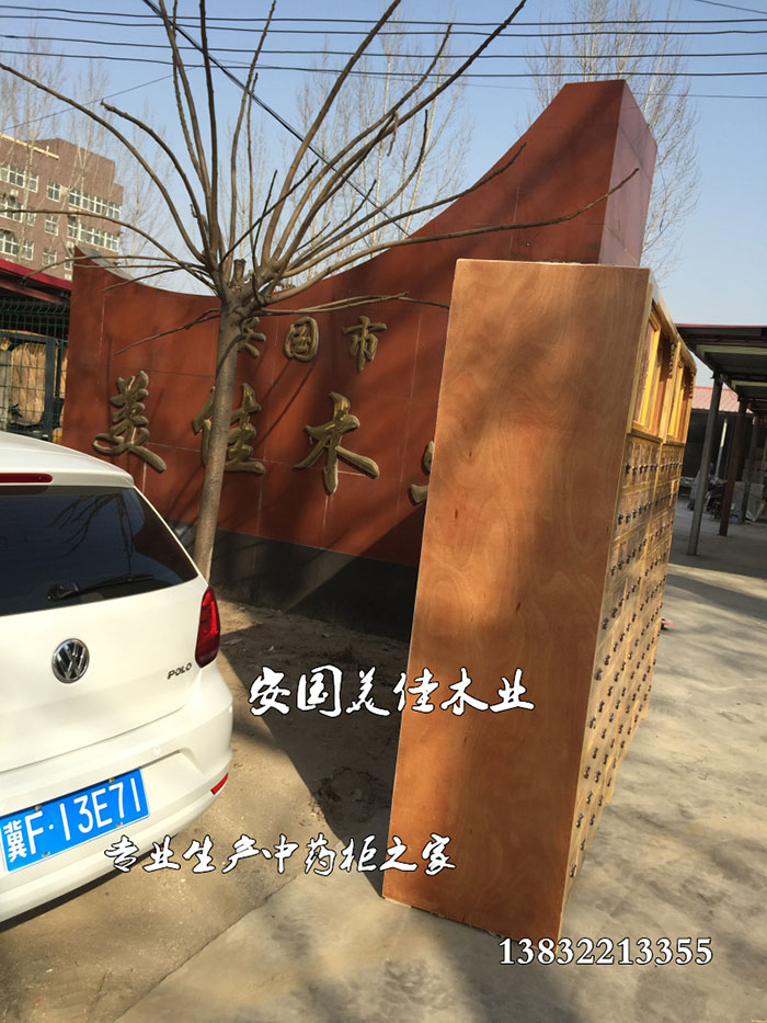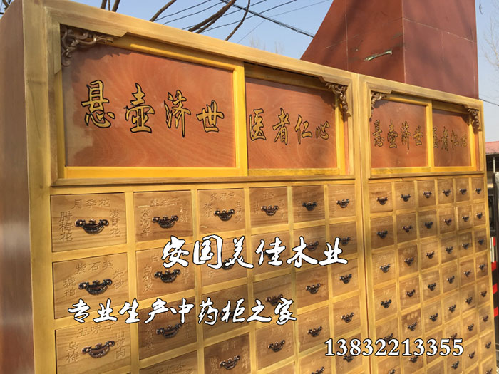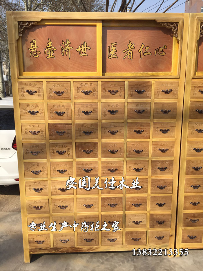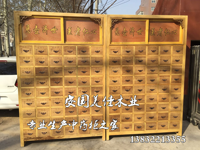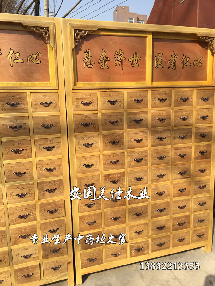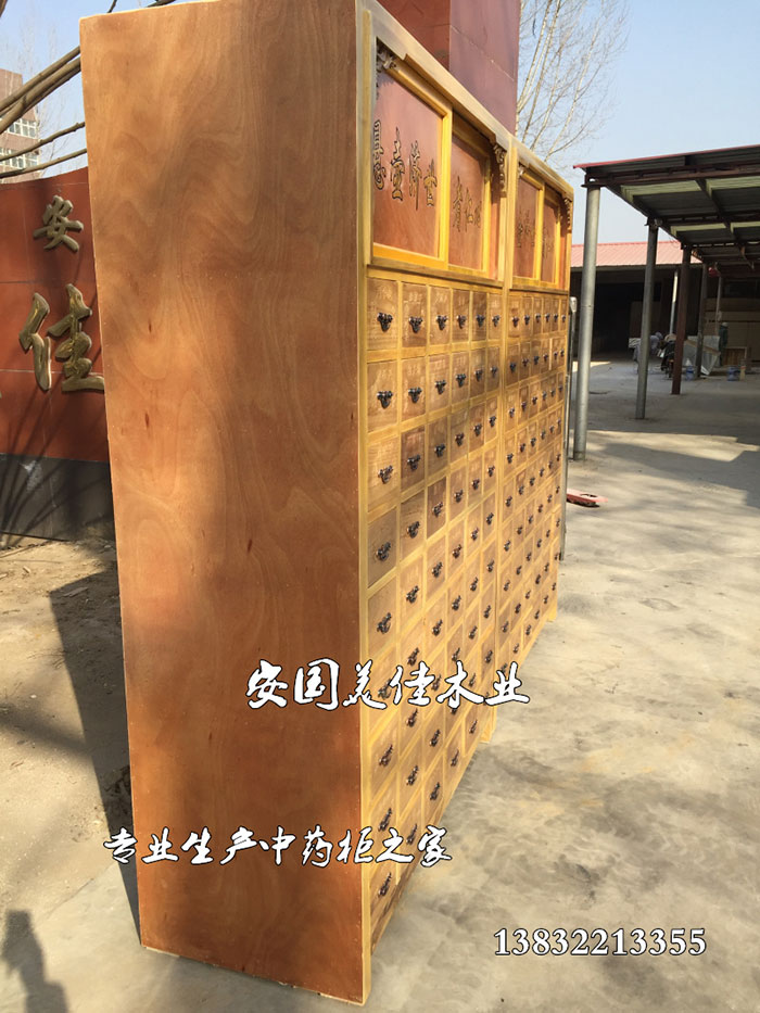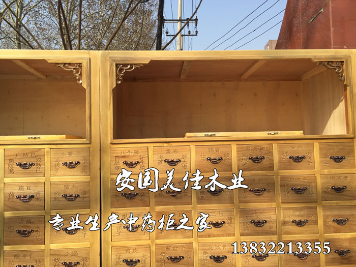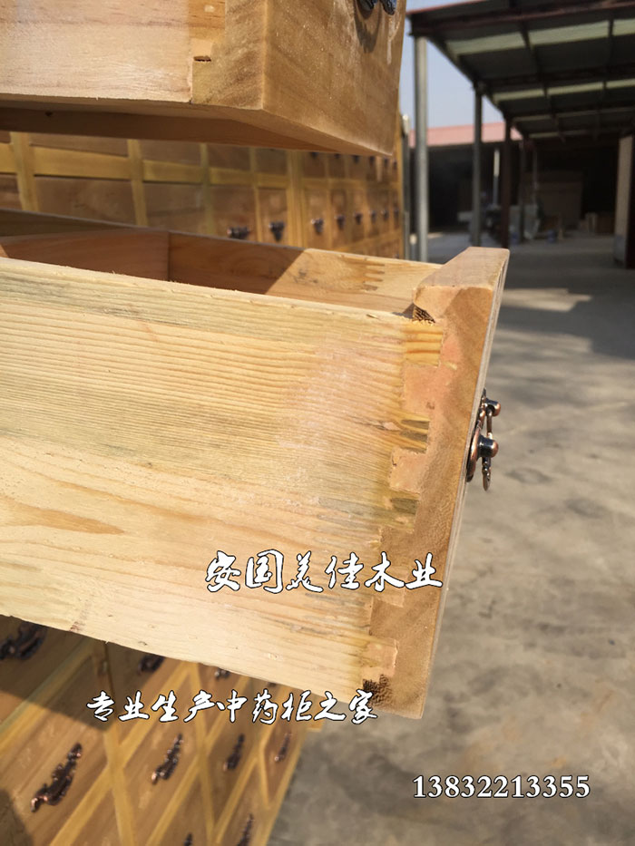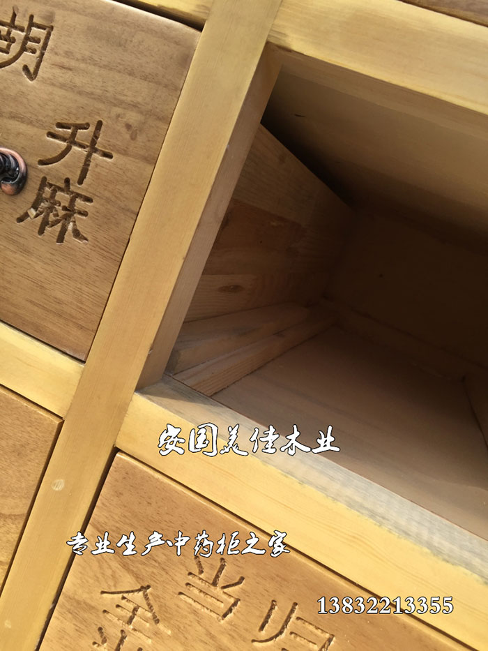 中藥柜尺寸---高215公分,寬140公分,厚60公分。抽屜面尺寸:寬15公分,高14公分。厚度17公分。 中藥柜用料---框架和抽屜選用優質樟松木,抽屜下面有五合板封底,防串味,抽屜底選用九厘板,中藥柜的后背兩側頂部選用五合板。 中藥柜款式---橫六豎九款。橫著六個抽屜,豎著八層抽屜,較下面的三個大抽屜,每個抽屜兩味藥,每個中藥柜可以裝150味藥。 中藥柜顏色---經典原木色花紋烤漆。抽屜面板雕刻字體。 中藥柜用漆---亮光或者半啞環保聚脂漆水房烤漆。 中藥柜拉環---超精致拉手。