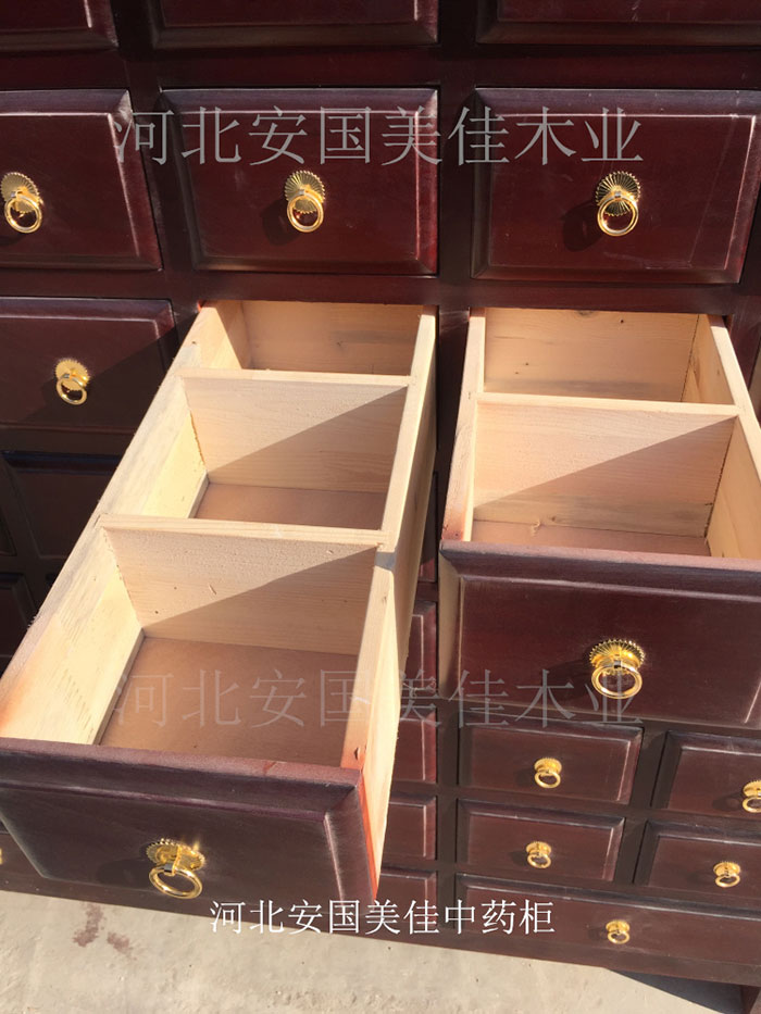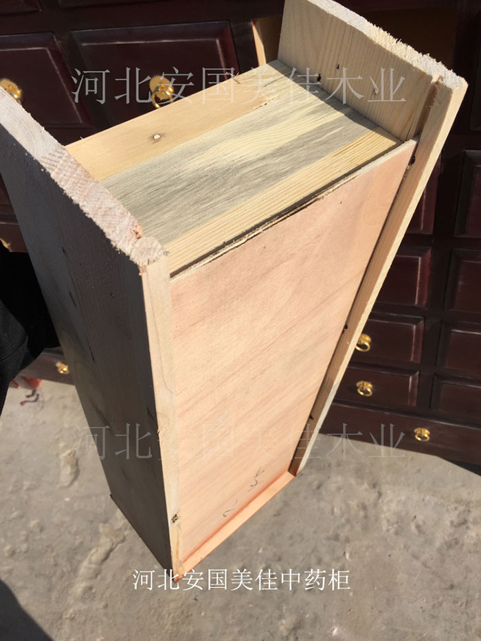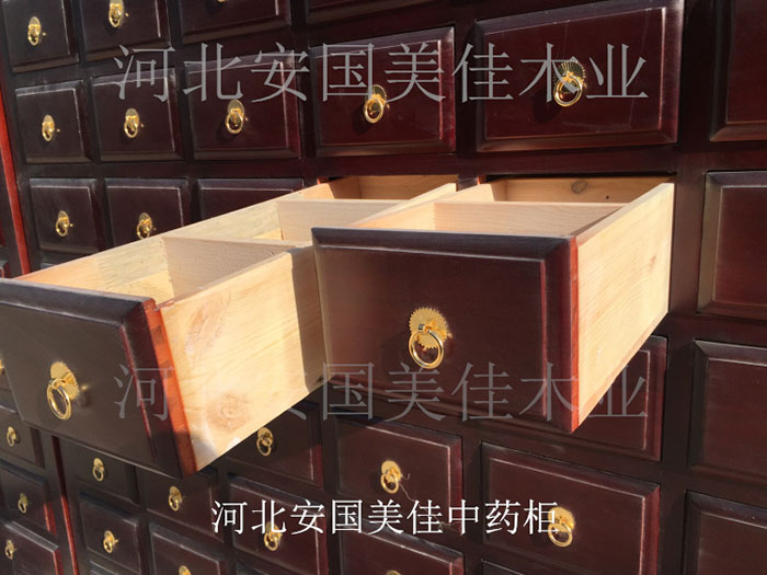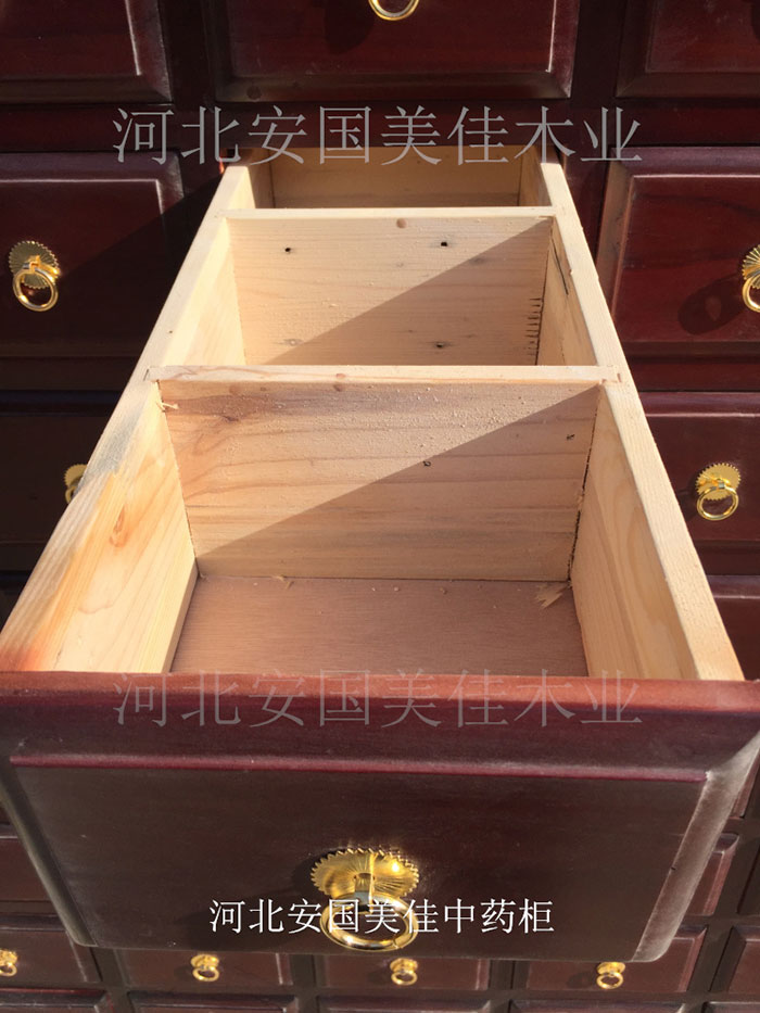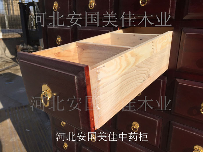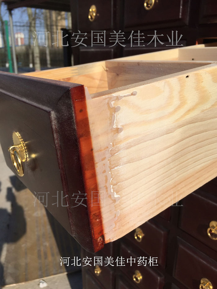 中藥柜用料---框架和抽屜選用優(yōu)質(zhì)樟松木,抽屜下面有五合板封底,防串味,抽屜底選用七和板,中藥柜的后背兩側(cè)頂部選用五合板。