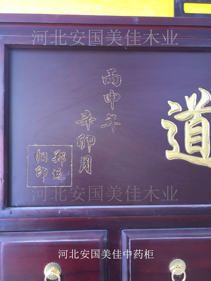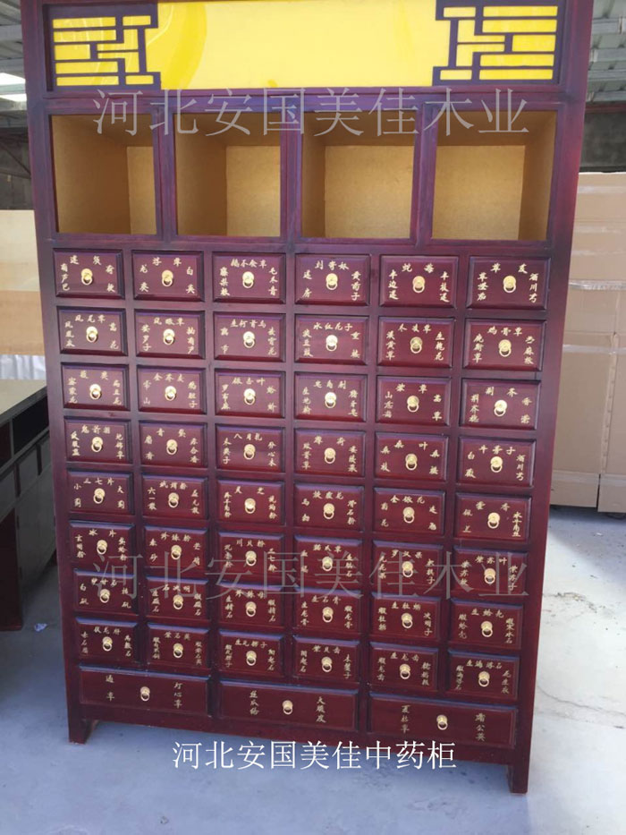 中藥柜款式---橫六豎九款。橫著六個抽屜,豎著八層抽屜,較下面的三個大抽屜,每個抽屜兩味藥,每個中藥柜可以裝150味藥。上部分亞克力雕花。