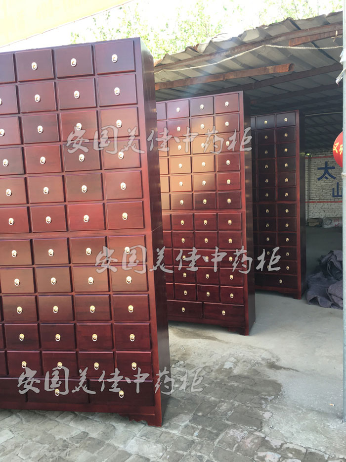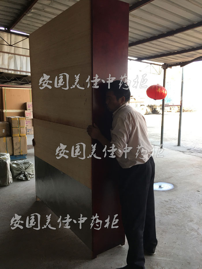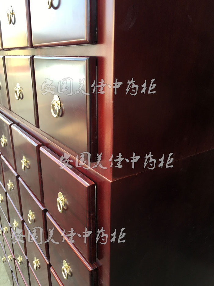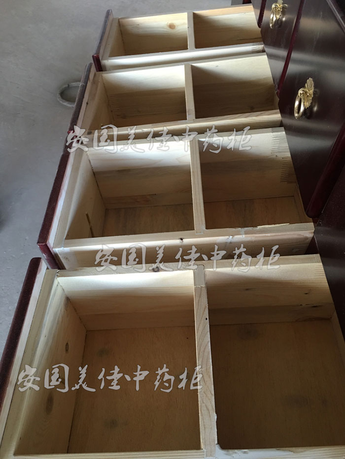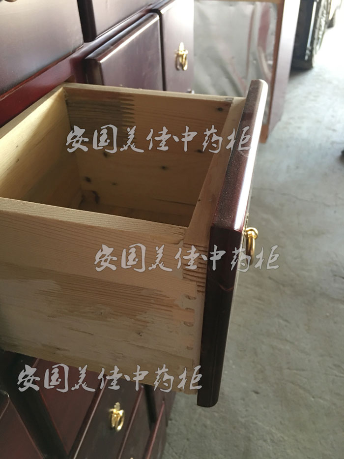 中藥柜用料---框架和抽屜選用優(yōu)質(zhì)樟松木,抽屜下面有五合板封底,防串味,抽屜底選用九厘板,中藥柜的后背兩側(cè)頂部選用七合板。