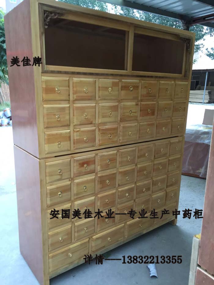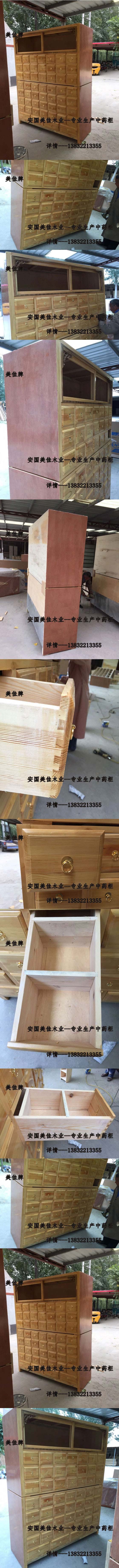 中藥柜用料---框架和抽屜選用優質樟松木,抽屜下面有五合板封底,防串味,抽屜底選用七合板,中藥柜的后背兩側頂部選用七合板。中藥柜款式---橫七豎八款。橫著七個抽屜,豎著八層抽屜,較下面的四個大抽屜,每個抽屜兩味藥,每個中藥柜可以裝155味藥。分體柜。中藥柜顏色---經典原木色花紋烤漆。中藥柜用漆---亮光或者半啞環保聚脂漆水房烤漆。中藥柜拉環----超精致純銅拉環。