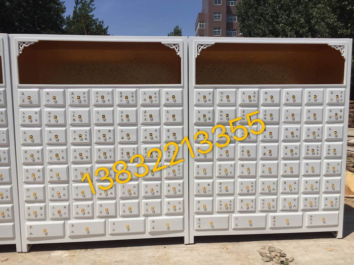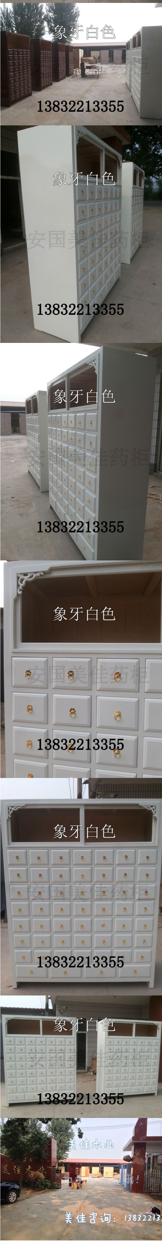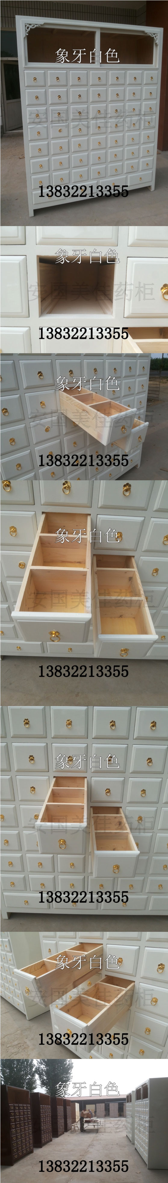 中藥柜尺寸---高215公分,寬170公分,厚60公分。抽屜面尺寸:寬18公分,高19公分。中藥柜用料---框架和抽屜選用優質樟松木,抽屜下面有五合板封底,防串味,抽屜底選用九厘板,中藥柜的后背兩側頂部選用五合板。中藥柜款式---橫七豎八款。橫著七個抽屜,豎著八層抽屜,較下面的四個大抽屜,每個抽屜兩味藥,每個中藥柜可以裝155味藥。中藥柜顏色---經典象牙白色烤漆。中藥柜用漆---亮光或者半啞環保聚脂漆水房烤漆。中藥柜拉環----超精致純銅拉環。