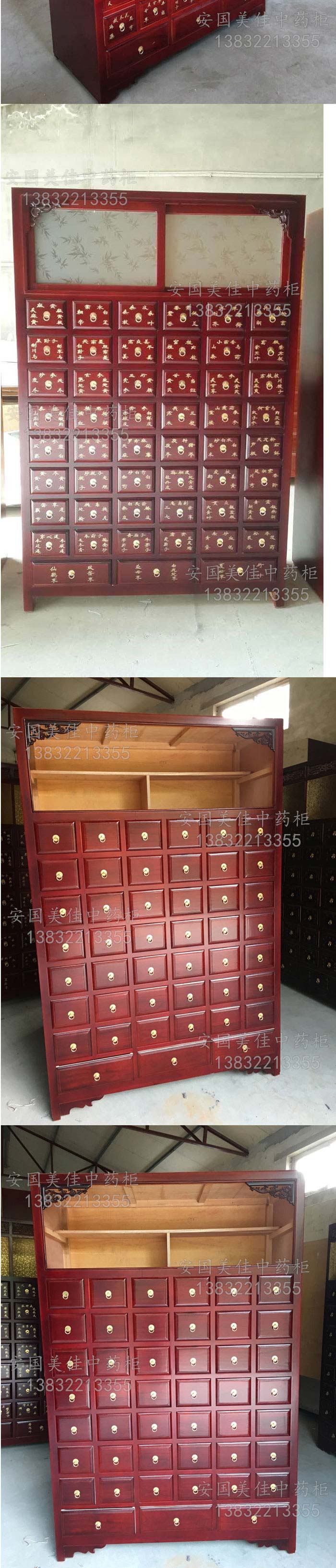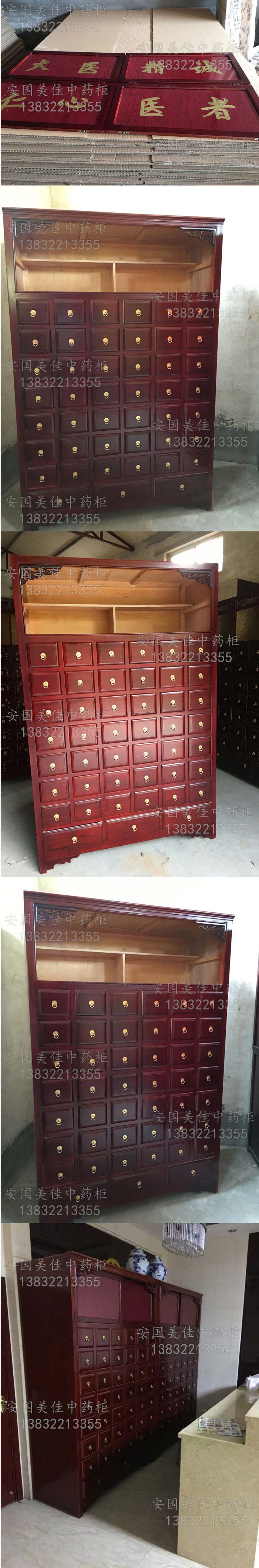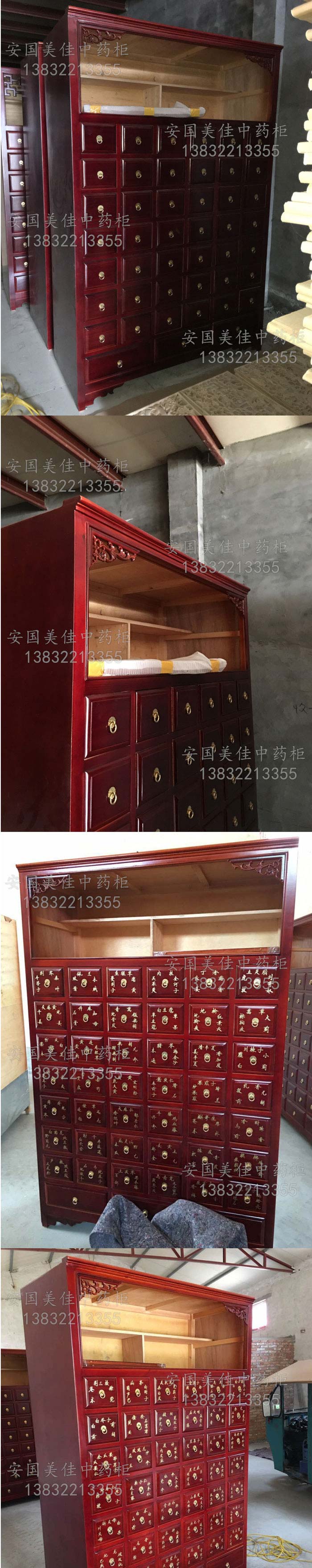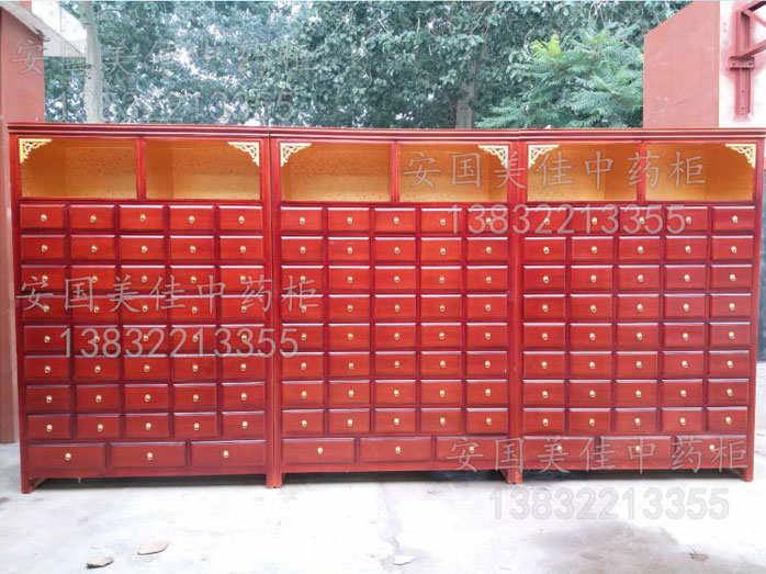 中藥柜尺寸---高215公分,寬140公分,厚60公分。抽屜面尺寸:寬16公分,高14公分,長度18公分。中藥柜用料---框架和抽屜選用優質樟松木,抽屜下面有五合板封底,防串味,抽屜底選用九厘板,中藥柜的后背兩側頂部選用五合板。中藥柜款式---橫六豎八款。橫著六個抽屜,豎著七層抽屜,較下面的三個大抽屜,每個抽屜兩味藥,每個中藥柜可以裝132味藥。中藥柜顏色---經典啞光酒紅色烤漆。中藥柜用漆---亮光或者半啞環保聚脂漆水房烤漆。中藥柜拉環----超精致純銅拉環。