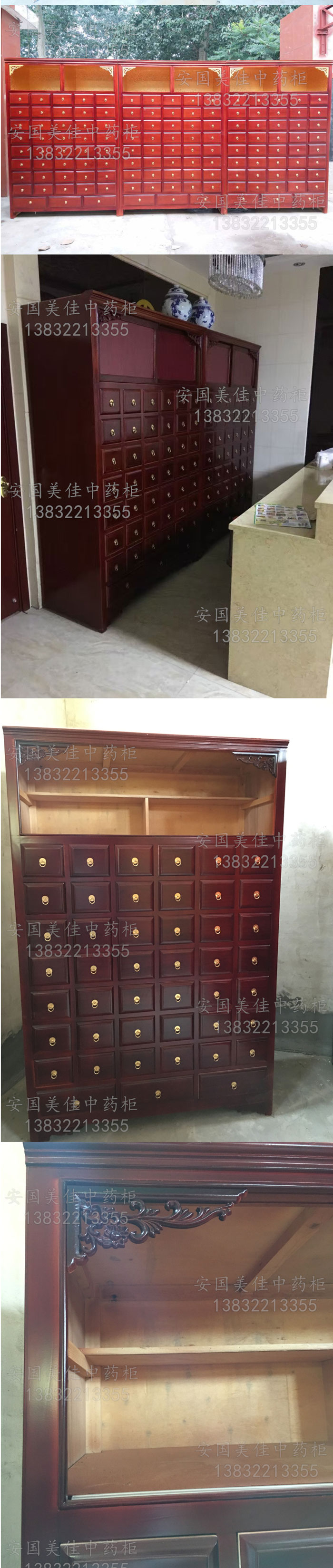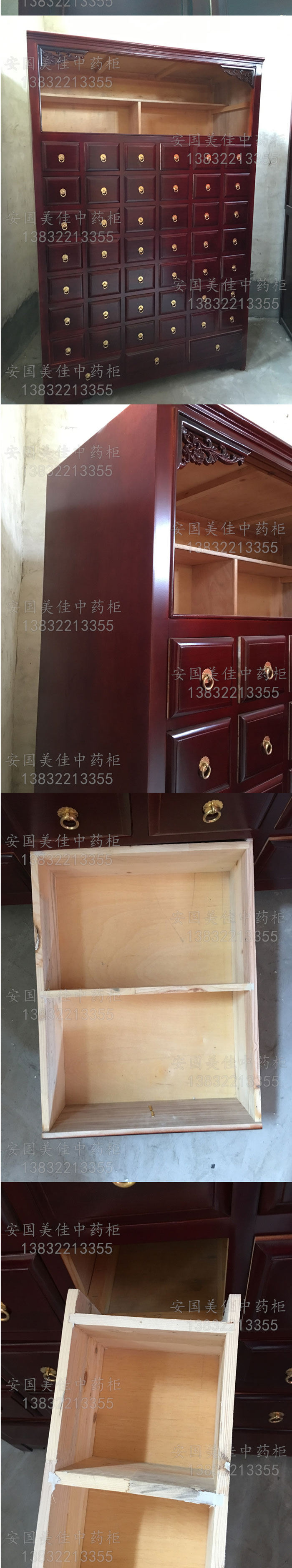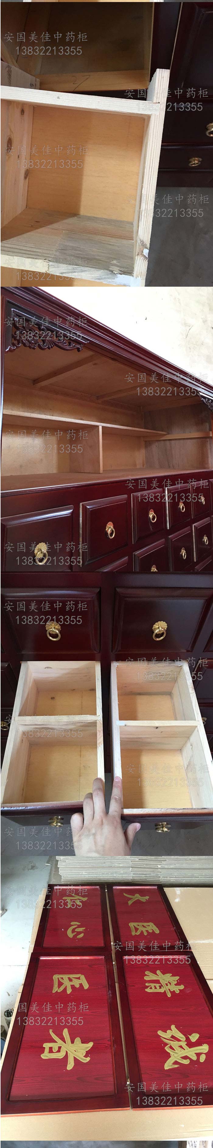 中藥柜尺寸---高215公分,寬140公分,厚60公分。抽屜面尺寸:寬16公分,高14公分,長度18公分。中藥柜用料---框架和抽屜選用優質樟松木,抽屜下面有五合板封底,防串味,抽屜底選用九厘板,中藥柜的后背兩側頂部選用五合板。中藥柜款式---橫六豎八款。橫著六個抽屜,豎著七層抽屜,較下面的三個大抽屜,每個抽屜兩味藥,每個中藥柜可以裝132味藥。中藥柜顏色---經典啞光酒紅色烤漆。中藥柜用漆---亮光或者半啞環保聚脂漆水房烤漆。中藥柜拉環----超精致純銅拉環。